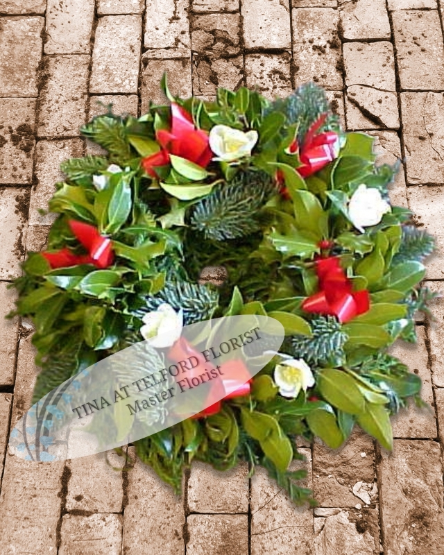 Artificial: Select festive Christmas roses and red ribbon, or add vibrant Poinsettias.